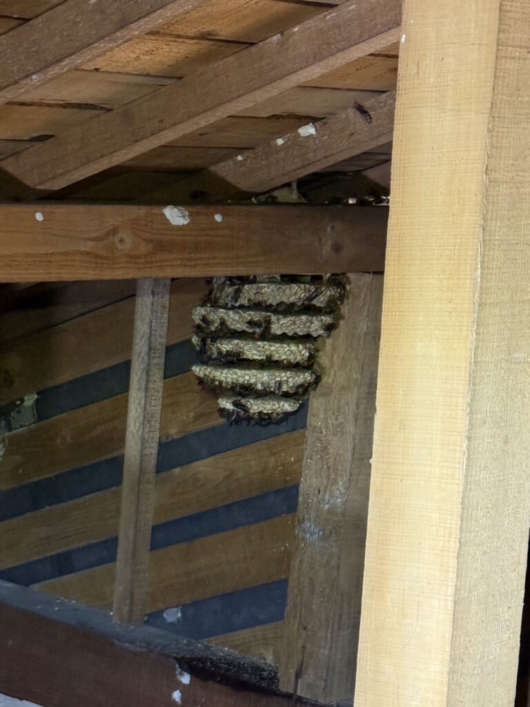 屋根裏の梁に、バスケットボールほどの大きさのスズメバチの巣を発見。
