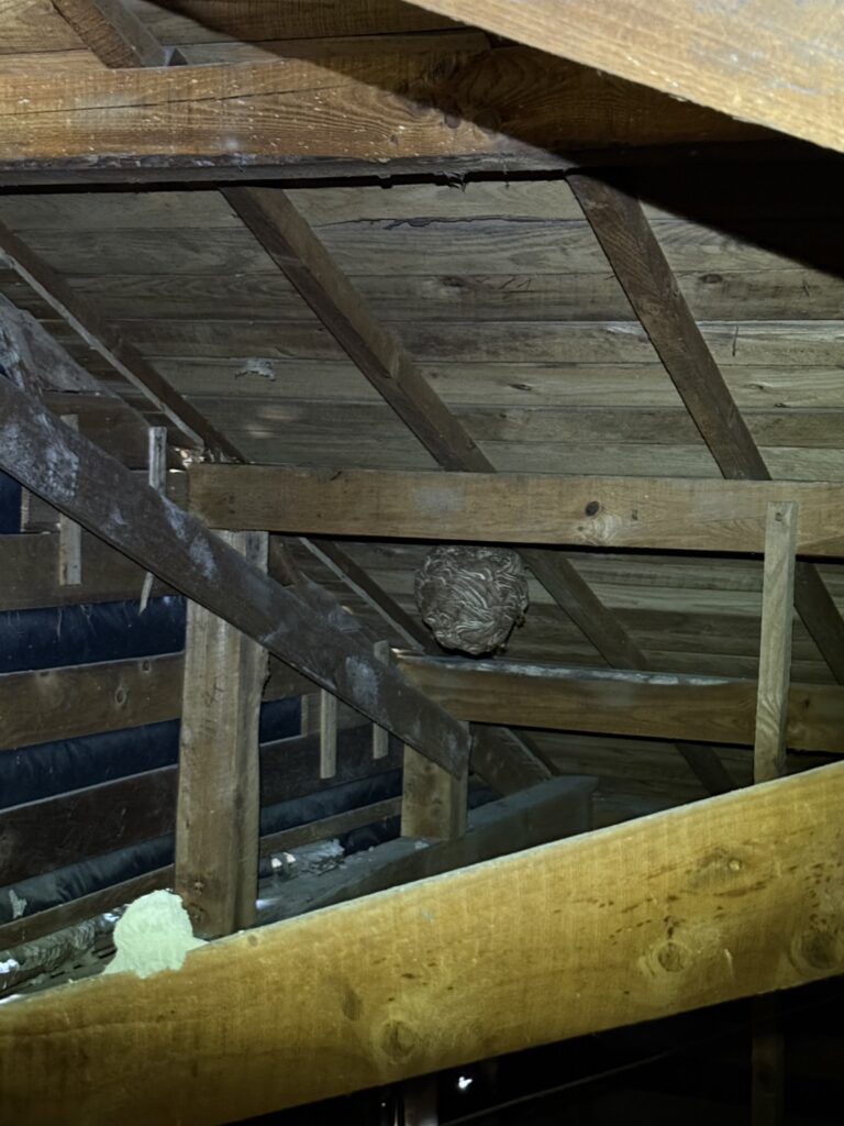 数日前にご連絡をいただき、当日はお昼頃に現場へ到着。確認したところ、屋根裏の3箇所から蜂の出入りがあり、複数の巣がある可能性が高いと判断。屋根裏へのアクセス開口部を探し、実際に上がってみると、なんとスズメバチの巣が3つ!さらに泥蜂の巣も1つ確認できました。