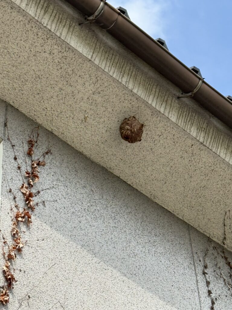 2階軒下にスズメバチの巣!ソフトボールより少し大きめを翌日スピード駆除|福山市御幸町
