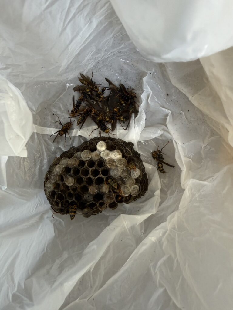 お電話いただいてから【約2時間】で現場に到着し、駆除作業は【わずか10分】で完了。蜂の動きをしっかり抑えて、周囲に被害が出ないよう慎重に対応しました。