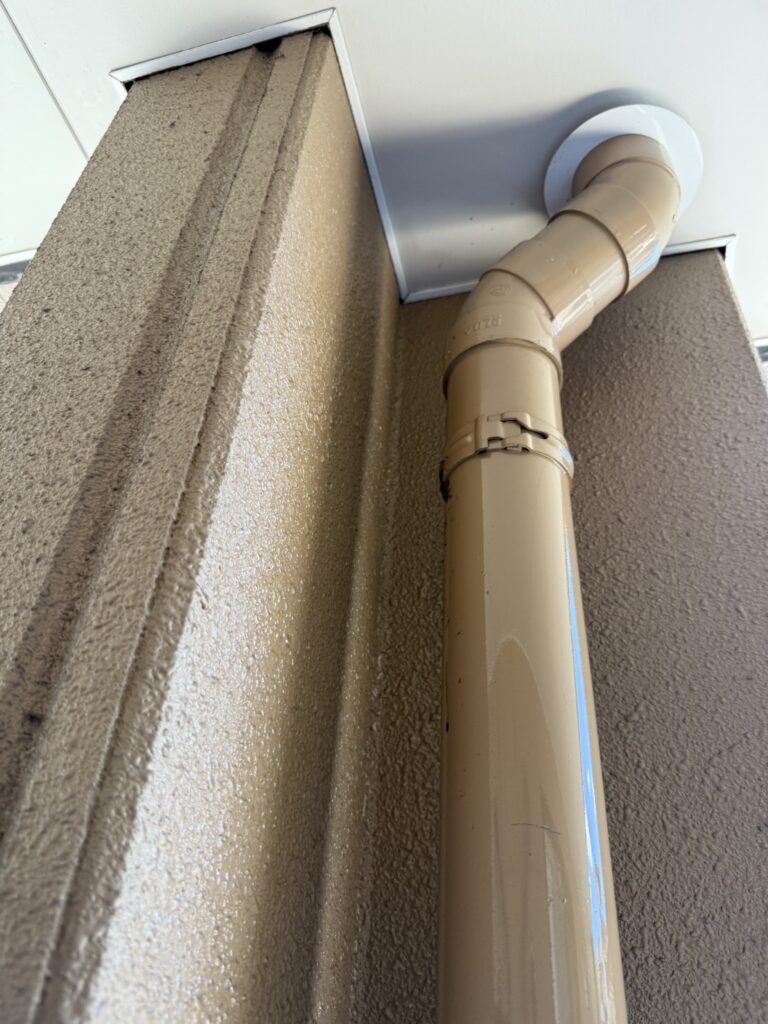 巣の場所は【1階ベランダ】の配管部分で、サイズは【拳ほどの大きさ】。写真からも分かるように、巣には多くのアシナガバチが集まっており、ご自身での対処は非常に危険な状況でした。