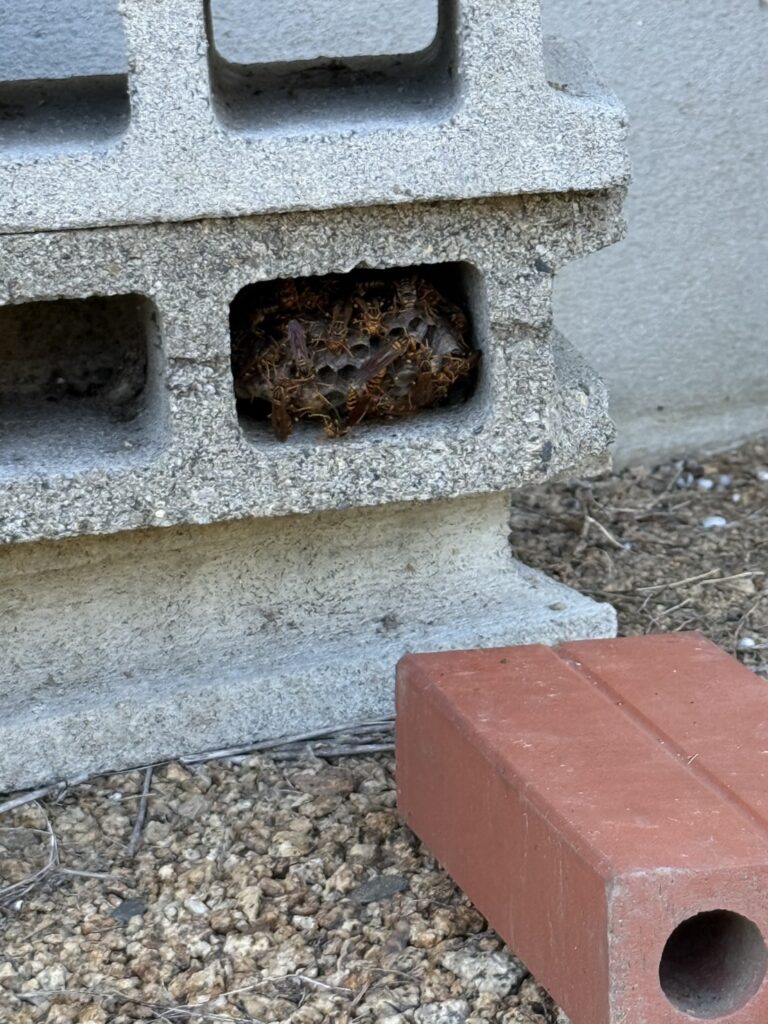 アシナガバチは静かに巣を作るため、気づいたときにはすでに危険な状態になっていることがあります。今回のようにブロックの中やちょっとした隙間は特に要注意です。蜂の動きを見かけたら、早めのご相談をおすすめします。