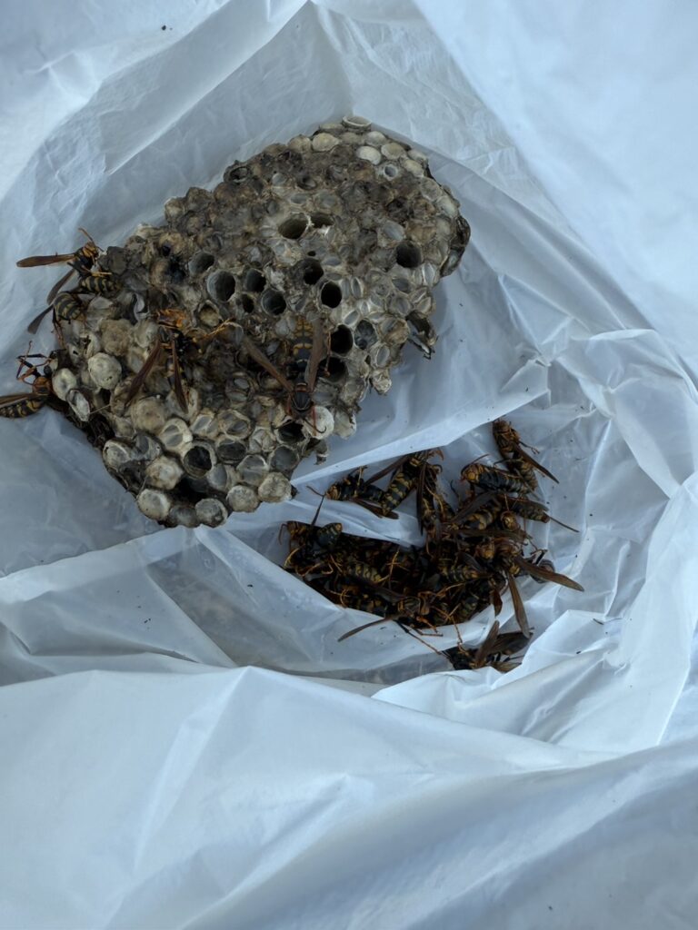 専用の薬剤をブロックの奥までしっかり噴射し、短時間で駆除を完了。巣を取り出すと、複数の成虫や幼虫が確認できました。安全を最優先に、丁寧に作業を行いました。