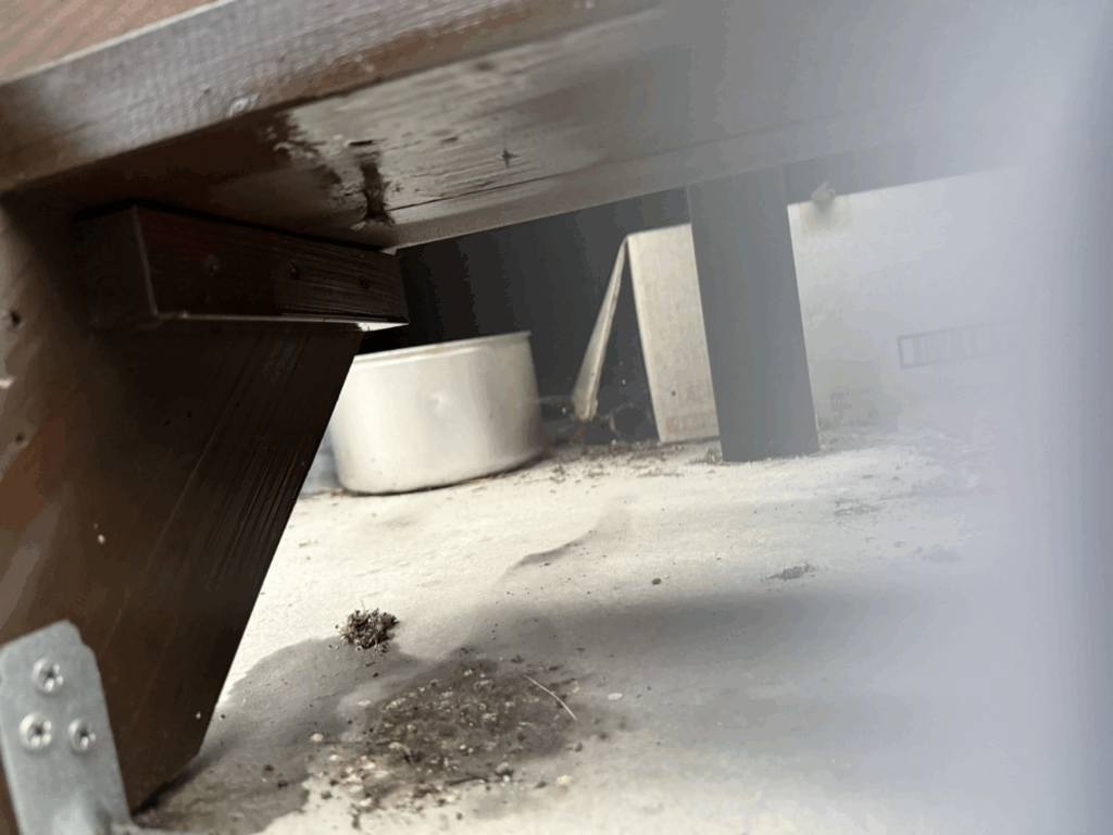 現場到着はご連絡から約1時間後。確認すると、ウッドデッキの下に野球ボールほどの大きさのアシナガバチの巣を発見。玄関近くでこの状況は、刺傷リスクが非常に高く早急な駆除が必要です。