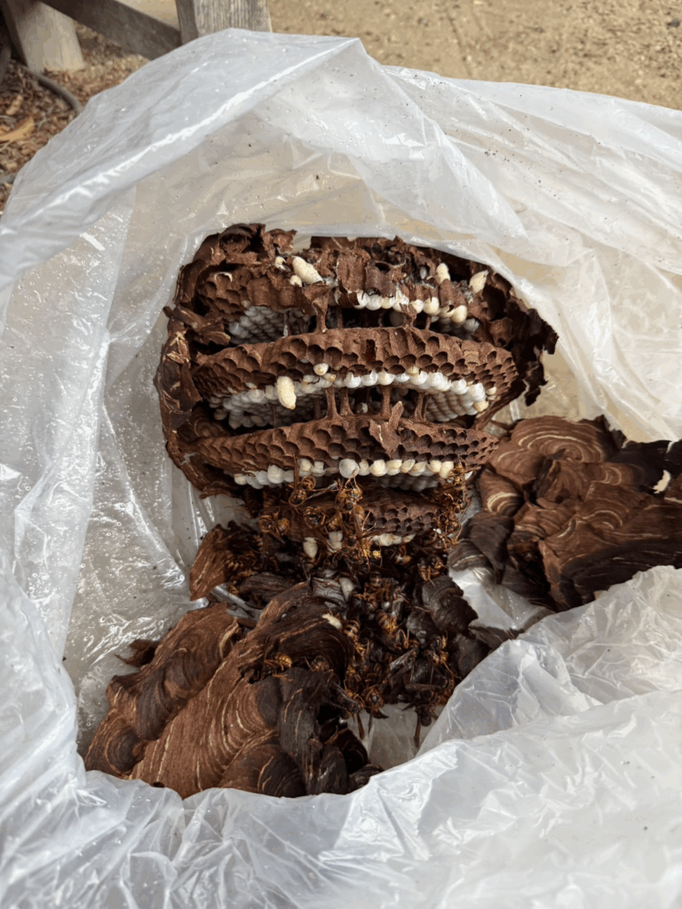 作業中も終始見守ってくださり、駆除後は巣の構造や蜂の生態に興味を持たれていました。「こんなに大きくなるなんて驚きました」とのお声をいただきました。