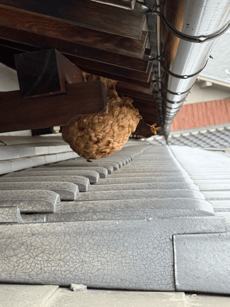 岡山市北区にて、**2階軒下に作られたスズメバチの大きな巣(バスケットボールサイズ)**を駆除しました。お客様から「周りに蜂がいっぱい飛んでいて怖い」とご連絡いただき、現地を確認すると、瓦屋根の軒下に大きな巣を発見しました。