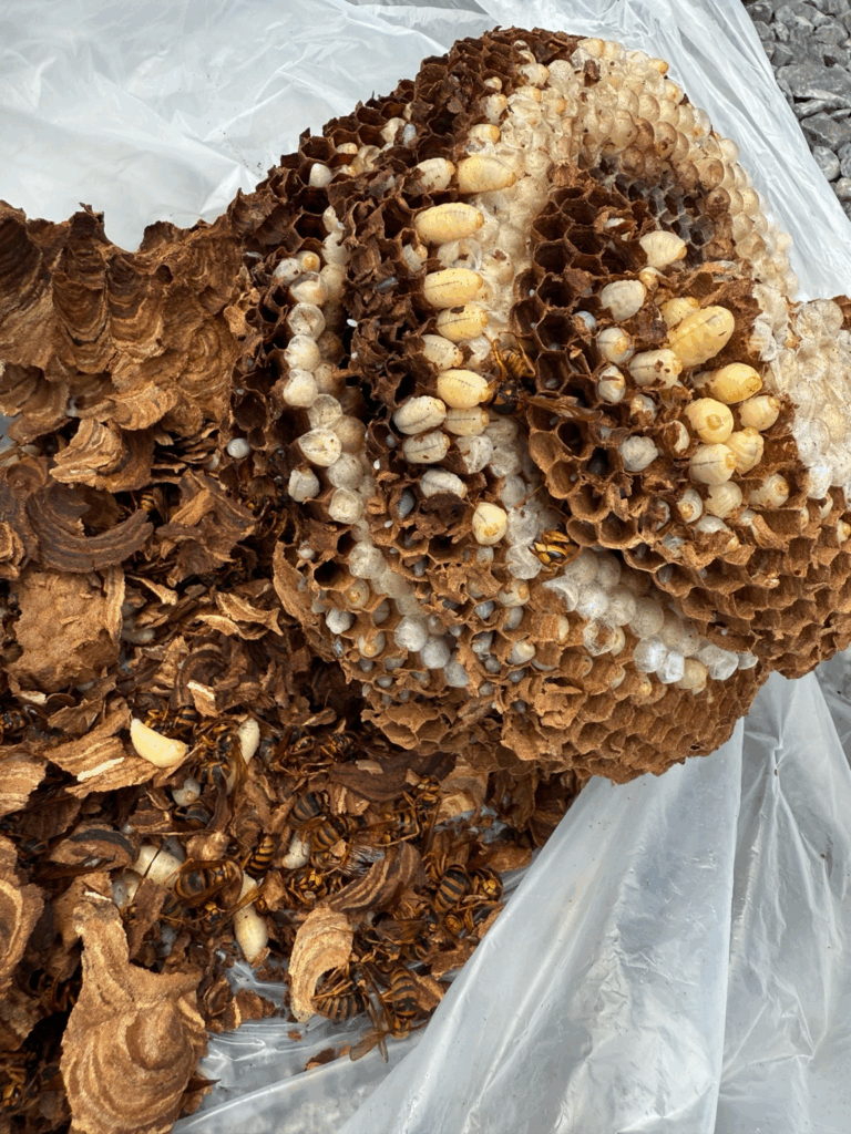3. 巣の中には大量の幼虫と働き蜂がいて、放置するとさらに危険度が増す状態でした。