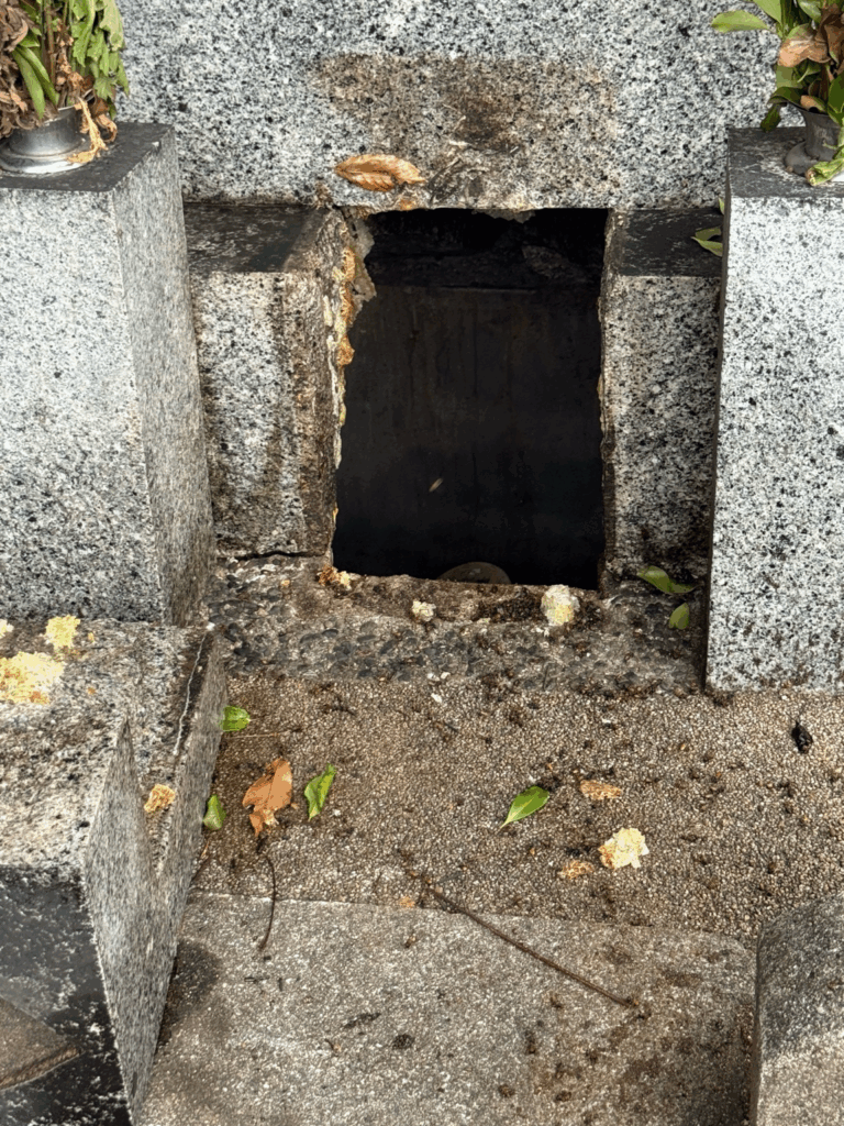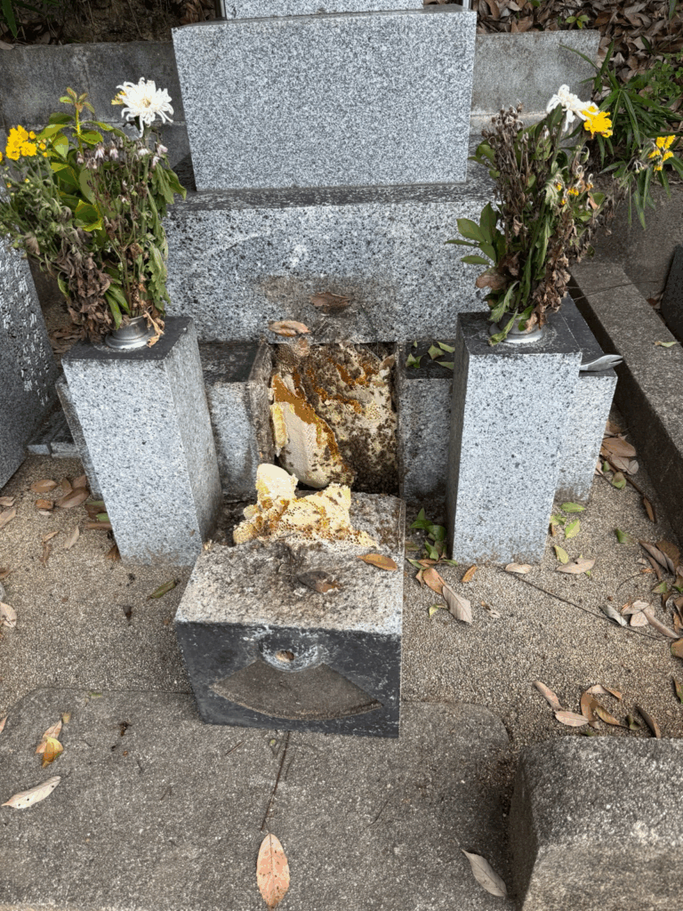 お墓の奥にまでミツバチが巣を作っていたため、できる範囲で駆除を実施。薬剤で活動中のミツバチを駆除し、手の届く範囲の巣を撤去しました。