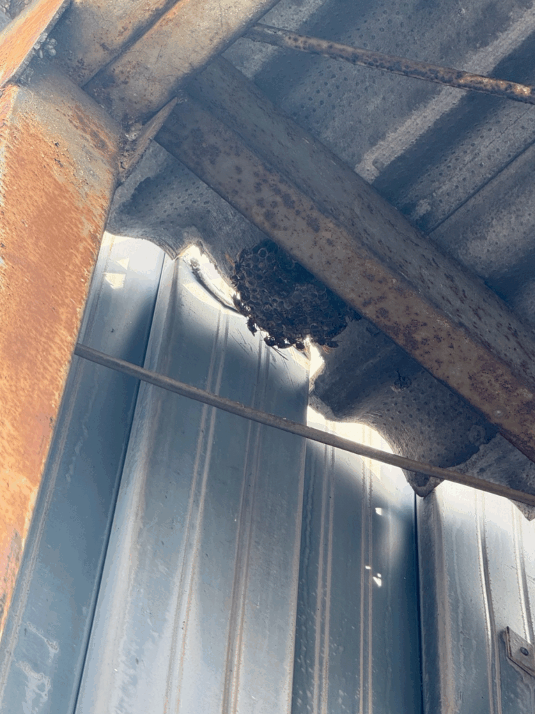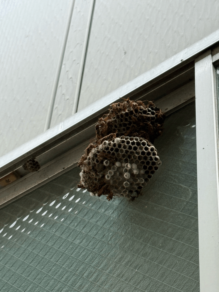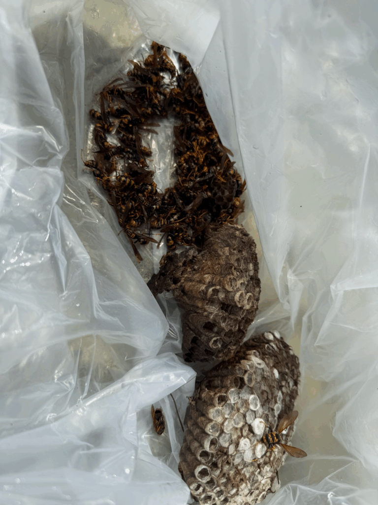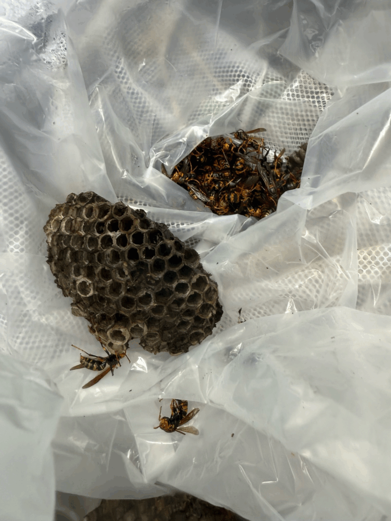最終的に、古い巣3つ・新しい巣5つ、合計8つもの巣を駆除しました。中には高さ6〜7mの場所もあり、高所作業を行いながらの駆除となりました。