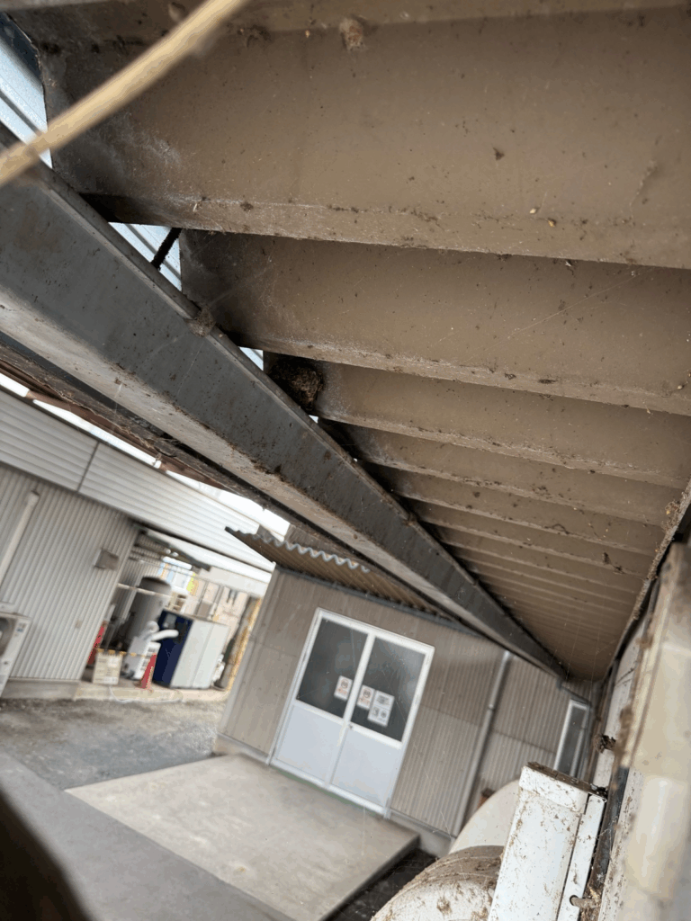 まずは見つけた巣をひとつずつ丁寧に駆除。すると、別の工場にもハチが飛んでいるとのことで、同行して追加調査を行いました。こちらでも新たに巣を発見し、駆除を実施。