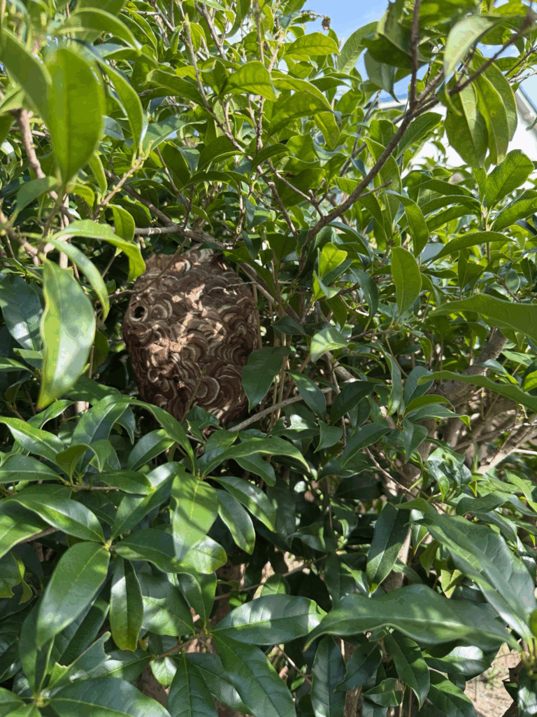 庭木の枝葉に隠れるように作られており、普段の生活では気づきにくい場所でした。蜂の数も増えており、刺される危険性が高い状態でした。