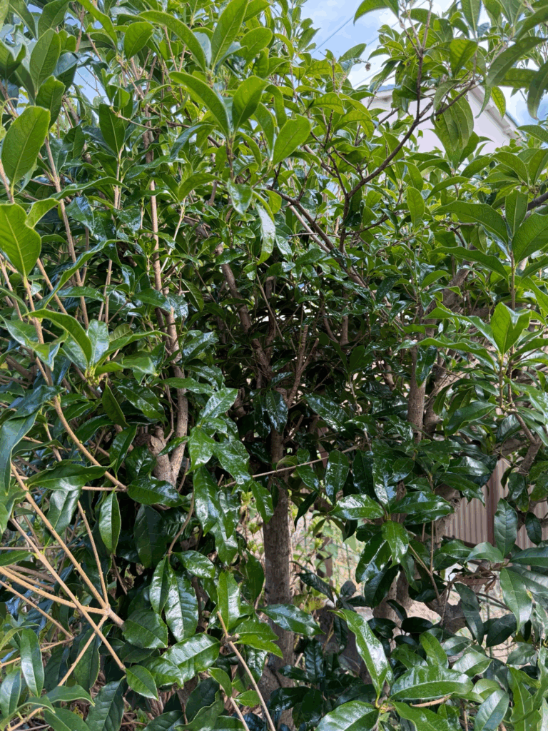 福山市新市町で庭木の茂みにできたスズメバチの巣を駆除しました