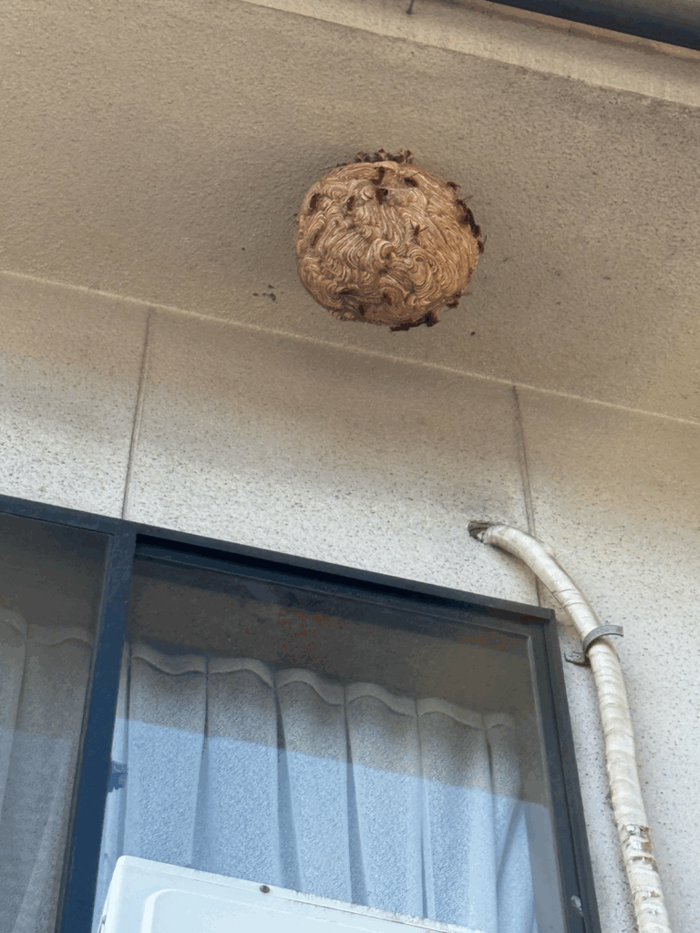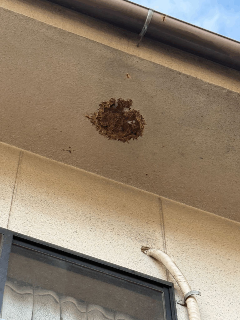 現場に到着して確認すると、立派なスズメバチの巣が軒下にしっかりと作られていました。お客様は「まったく気づかなかった」と驚かれていました。