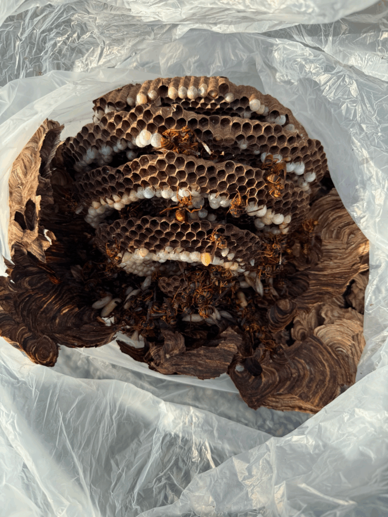 作業は約45分で完了し、巣を完全に撤去。蜂が戻ってこないよう再発防止の薬剤処理も実施しました。