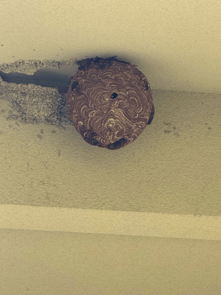 普段目にしない高所にできていたため、お客様もまったく気づかなかったとのこと。大きさもあり、刺される危険性が高い状況でした。