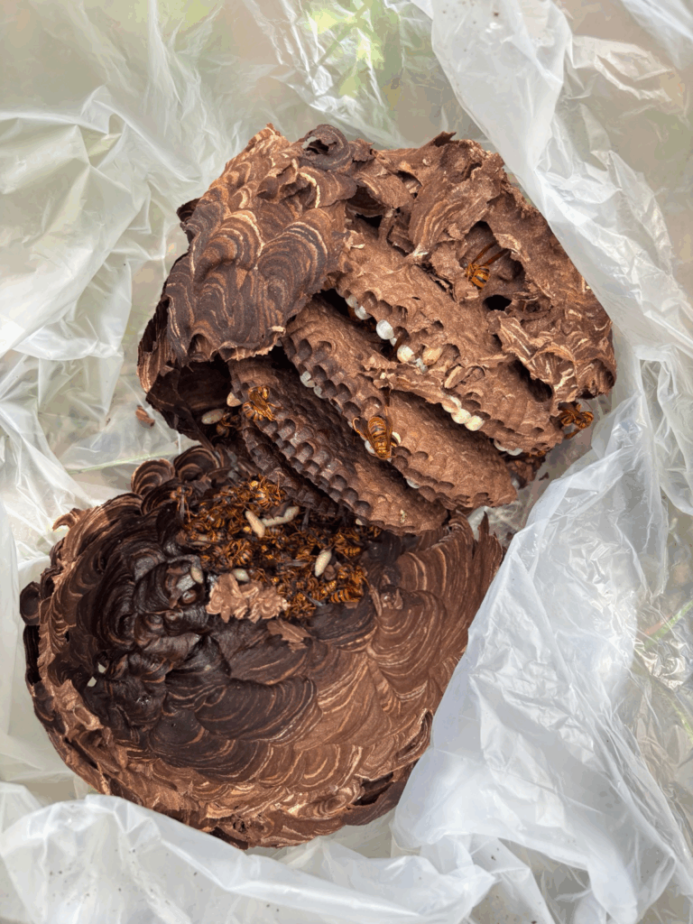 駆除時間は約45分で、蜂の巣本体と内部の幼虫・戻りバチもしっかり処理しました。