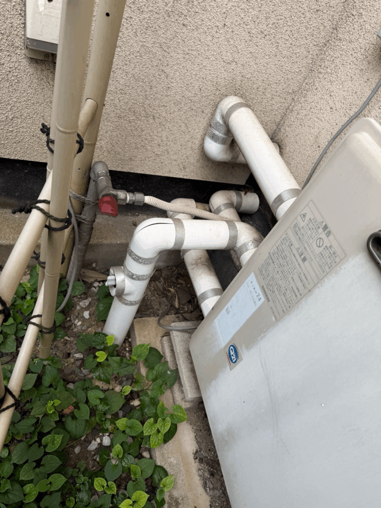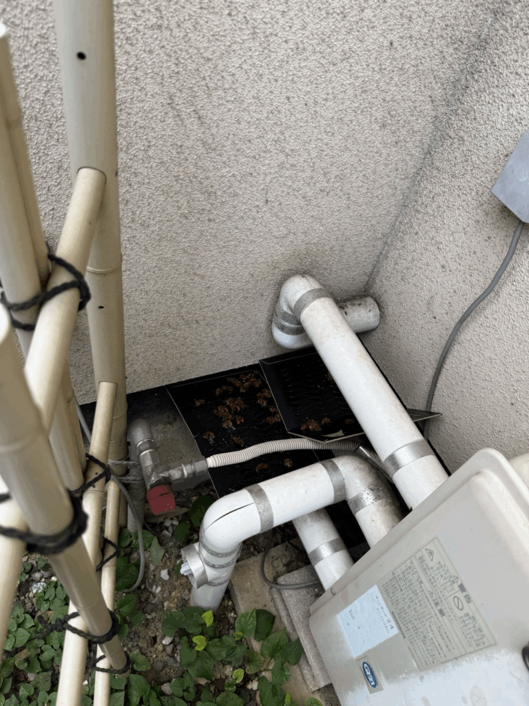 お客様宅の給湯器まわりからスズメバチが出入りしており、床下に巣を作っている可能性が高い状況でした。